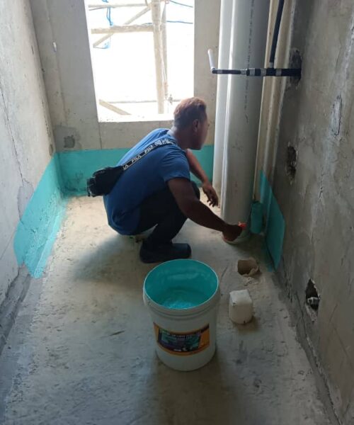 Dritech Chemicals supplied a combination of advanced waterproofing systems tailored to each area’s needs. The internal wet areas were treated with Dri-Lastic WP 20, a flexible, water-based waterproofing membrane that provides superior protection against water leakages. Its green-coloured finishing also allows easy QA/QC to ensure sufficient consumption at all areas.